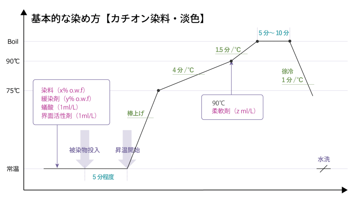 低温(80℃~90℃)で染着が終わってしまいますので、その間の昇温に時間をかけます。目安は4分/℃(4分で1℃上昇)です。